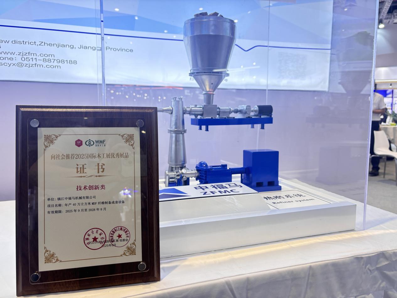 期间,由中国林业机械协会与雅式展览联合主办的“优秀展品推荐”活动在现场揭晓29项年度创新成果。镇江中福马机械有限公司的“年产40万立方米MDF纤维制备成套设备”获得“向社会推荐2025国际木工展优秀展品-技术创新类”奖项。
